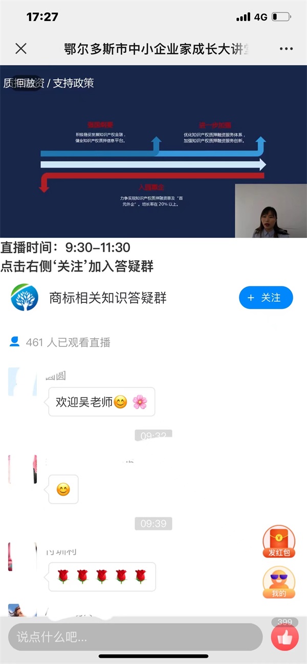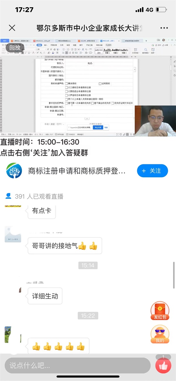 为进一步普及商标相关知识、提高中小企业商标运用及管理意识,按照《国家知识产权局关于开展2022年全国知识产权宣传周活动的通知》要求和自治区知识产权局的工作部署,4月25日,鄂尔多斯市市场监督管理局(知识产权局)、鄂尔多斯市工信局中小企业公共服务平台联合举办“商标相关知识、商标注册申请和商标质押登记”主题公益培训活动,本次培训以线上直播方式开展,全市中小企业管理者及工作人员共计860余人次观看直播。